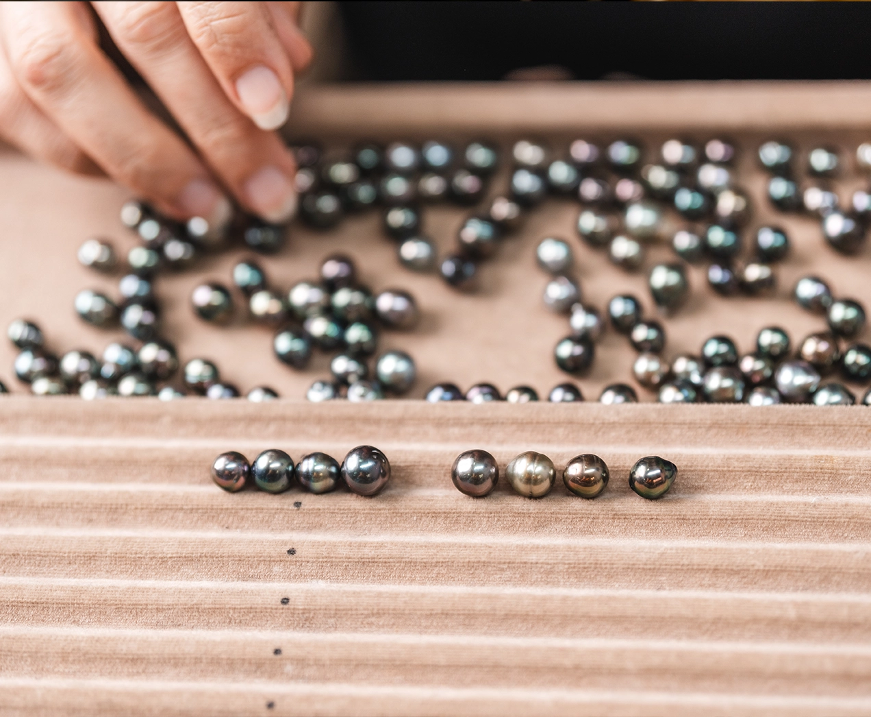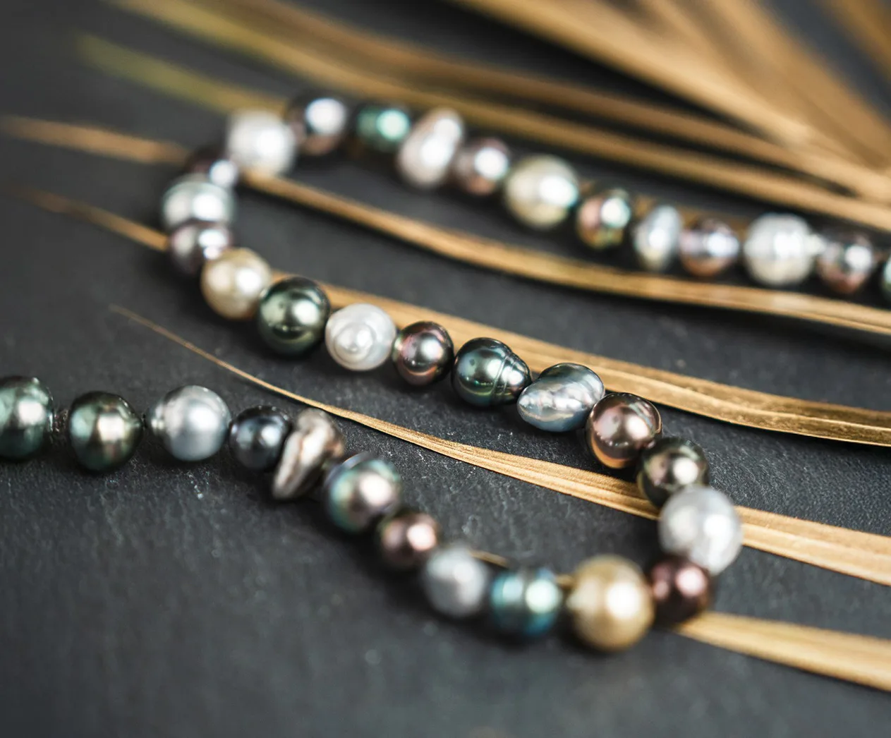 Par exemple, elle mélange parfois subtilement des perles de Tahiti de toutes formes et des perles appelées Keshi qui sont naturelles. Ces dernières, nées spontanément dans l’huître, se distinguent par leurs formes libres et irrégulières, aux reflets multiples : du gris argenté au vert profond, parfois teintés d’éclats dorés ou rosés. Rares et authentiques, elles donnent au collier tout son caractère et sa profondeur.