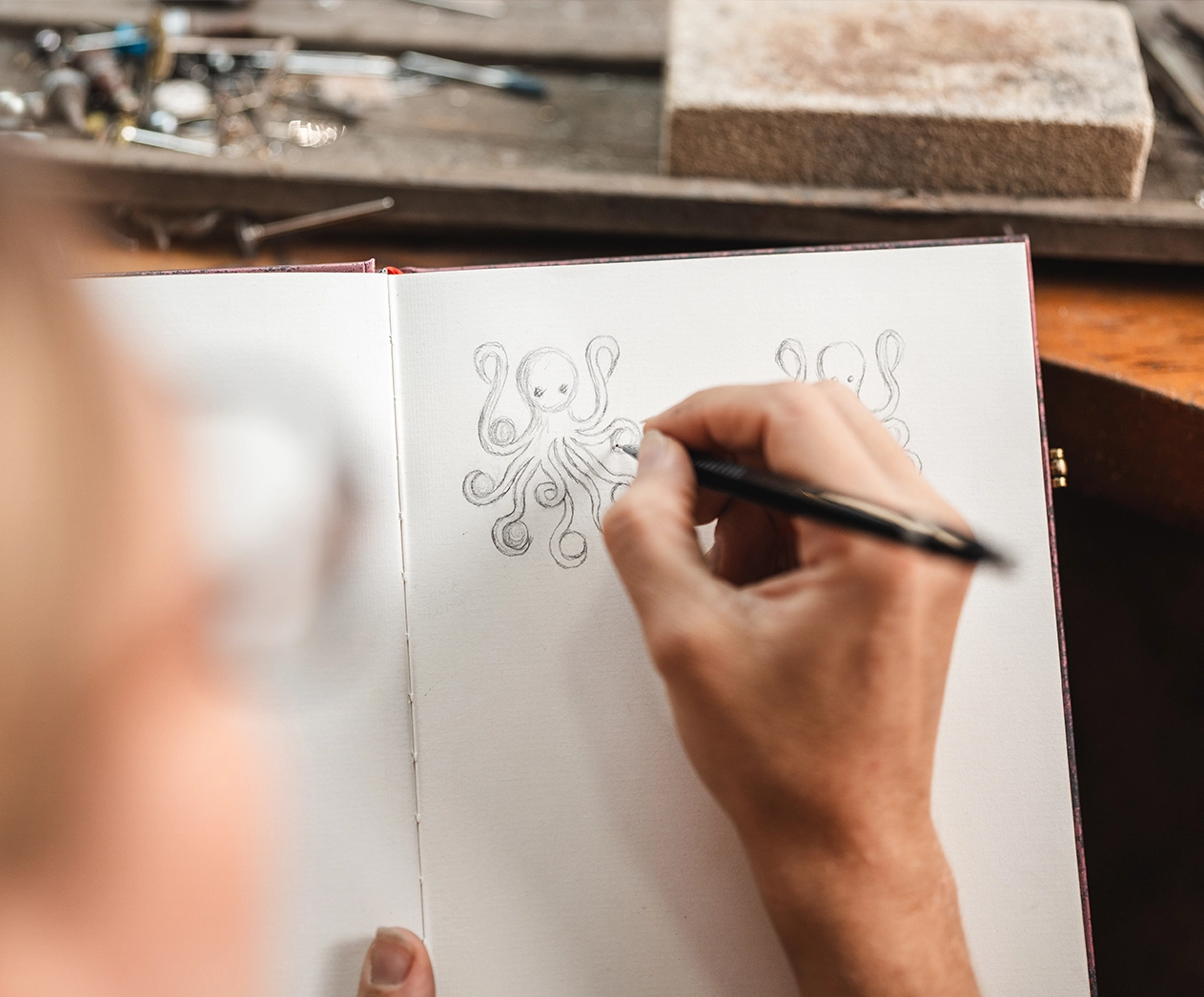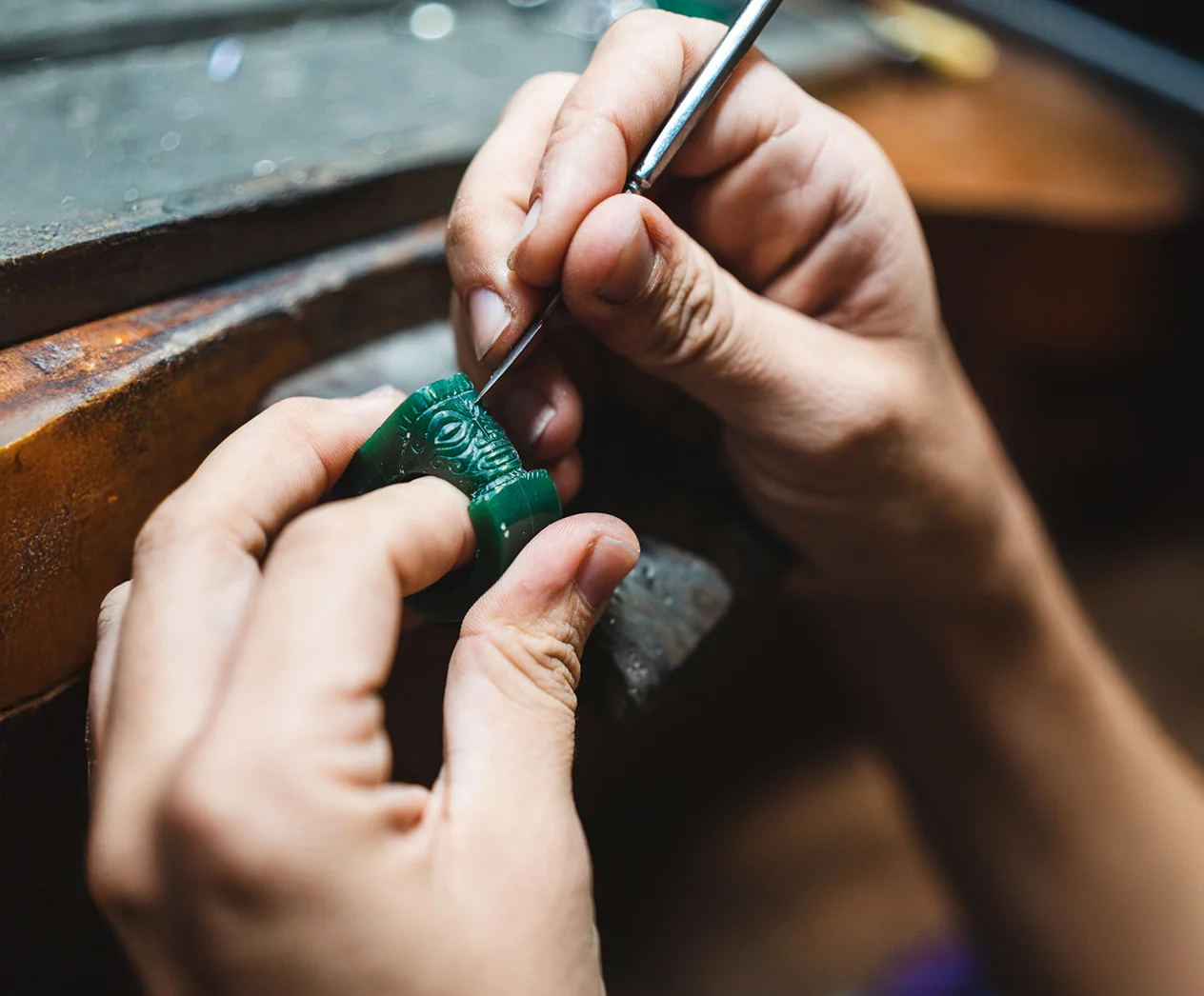 Lucie imagine alors la pièce et esquisse ses lignes. Sur un bloc de cire brute, elle sculpte avec minutie : la cire, fragile et éphémère, devient porteuse d’un futur trésor.